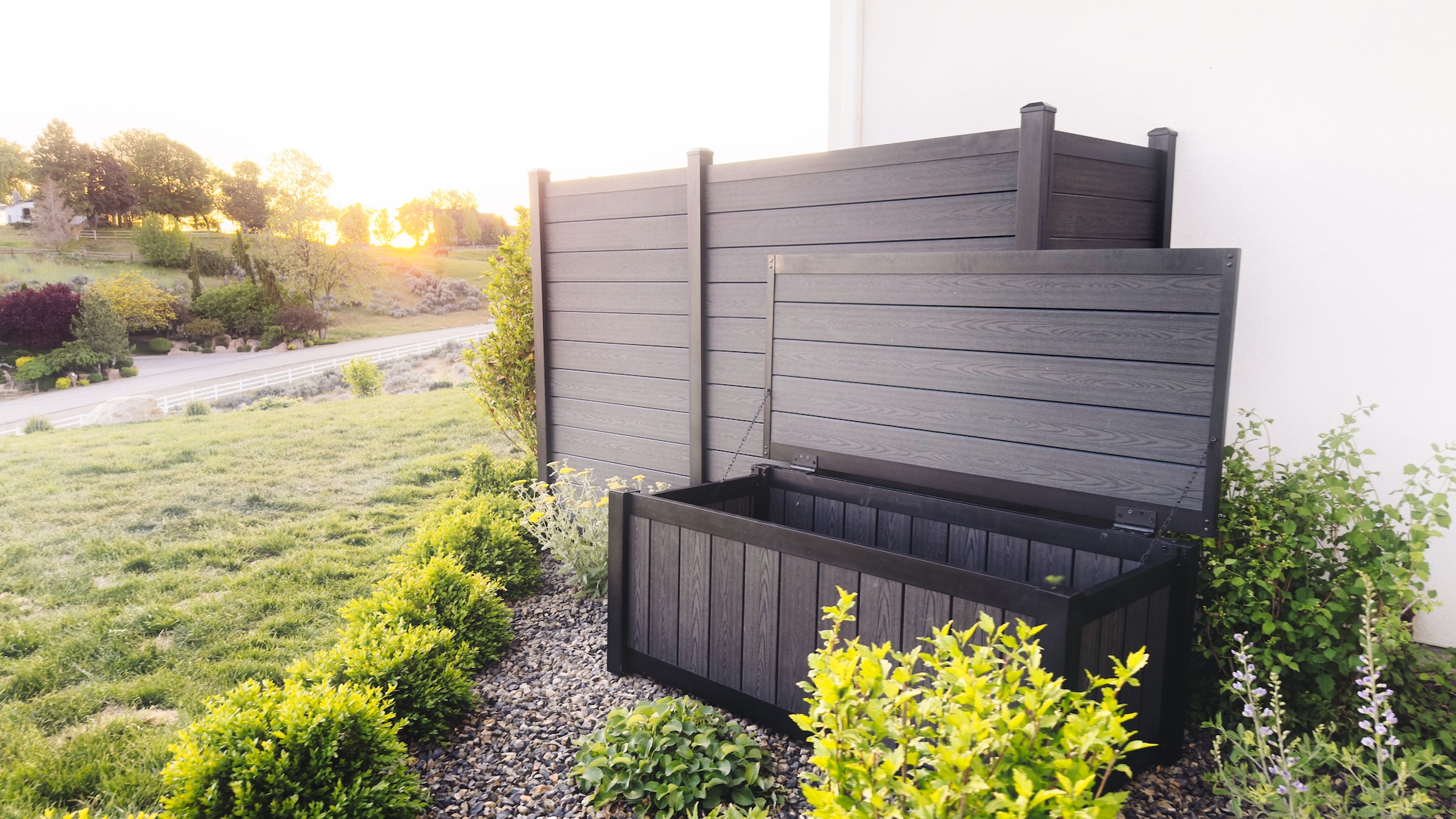This fence is becoming very popular here in treasure valley. Here we have aluminum posts and top and bottom rail. With aluminum you'll never have to worry about rust EVER. The fill that is in this image is a composite and it has a wood grain to it. Very solid fence that you'll never have to do anything for maintenance. You'll also see we created a pool box made from the same material for this client. Turned out super nice.