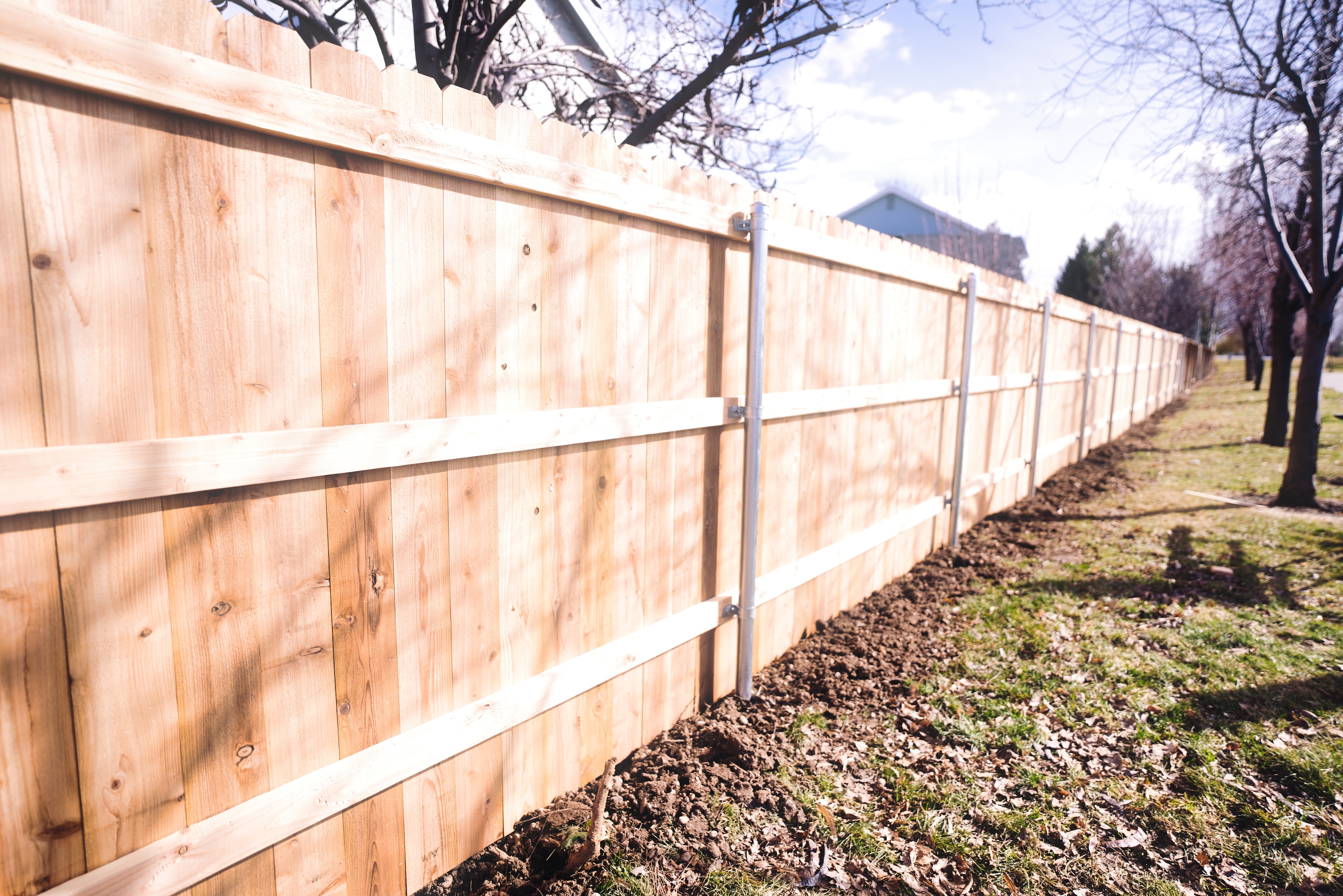 Cedar fence with circular posts. This is a very popular option since you'll never have to worry about your posts rotting or braking.