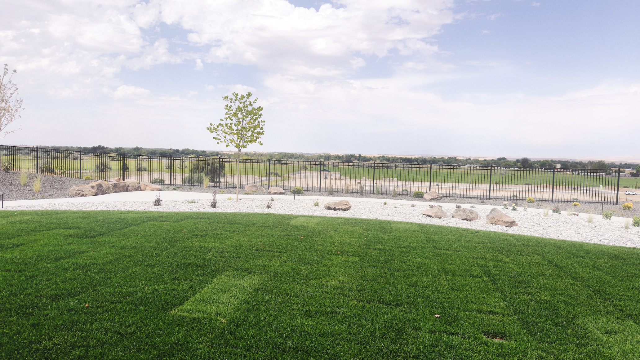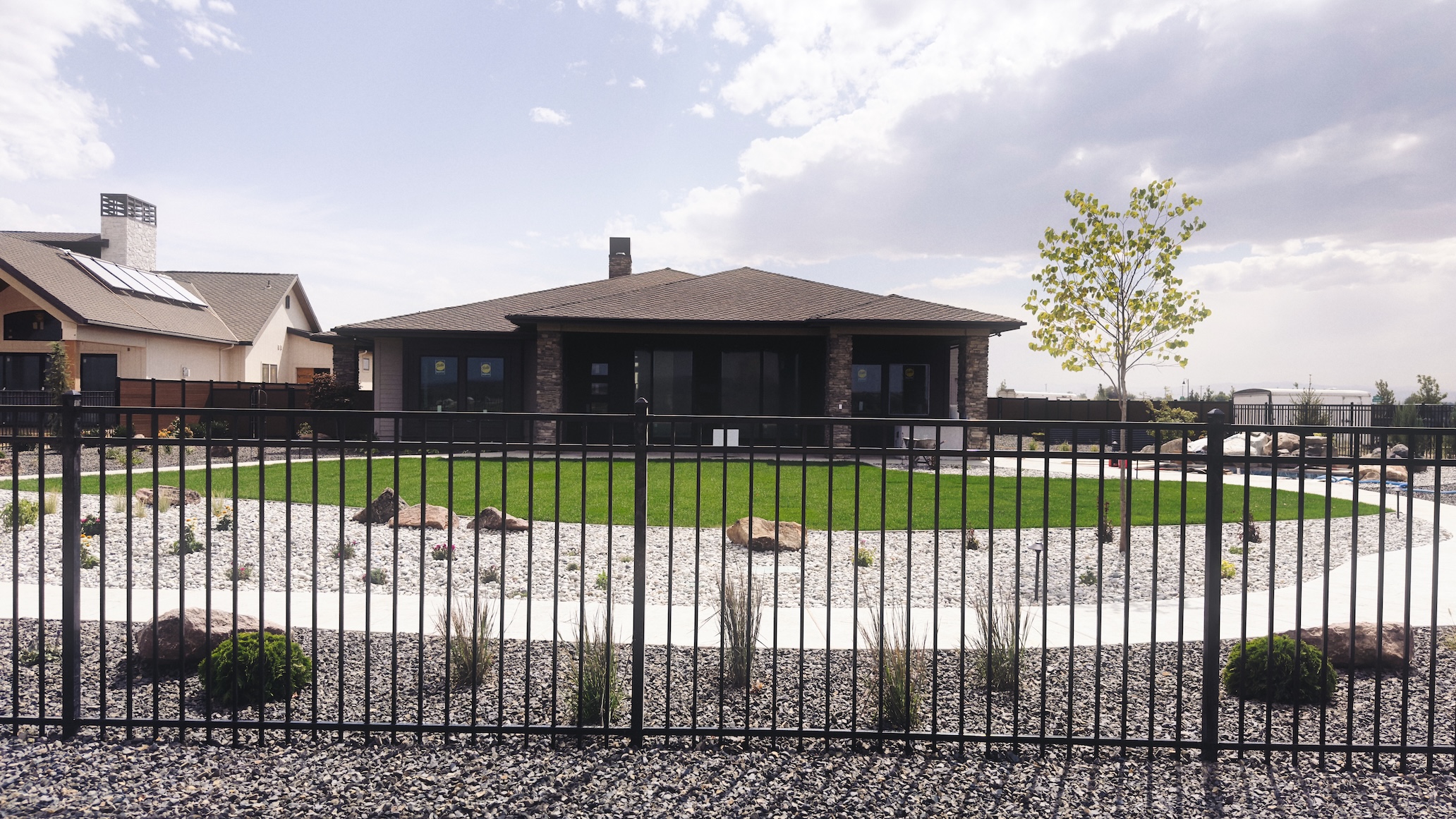 Here we have a 5' tall rackable iron fence. With rackable panels we are able to flow with the grade and eliminate gaps under the fence. No need for step downs to go with the grade of the terrain.